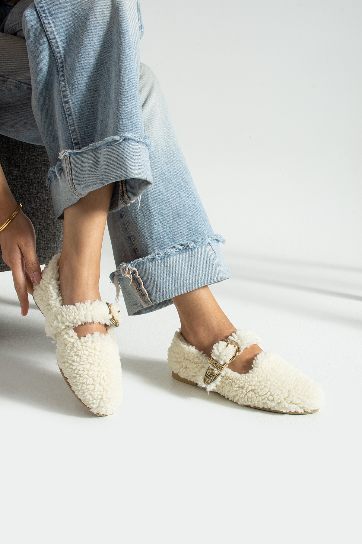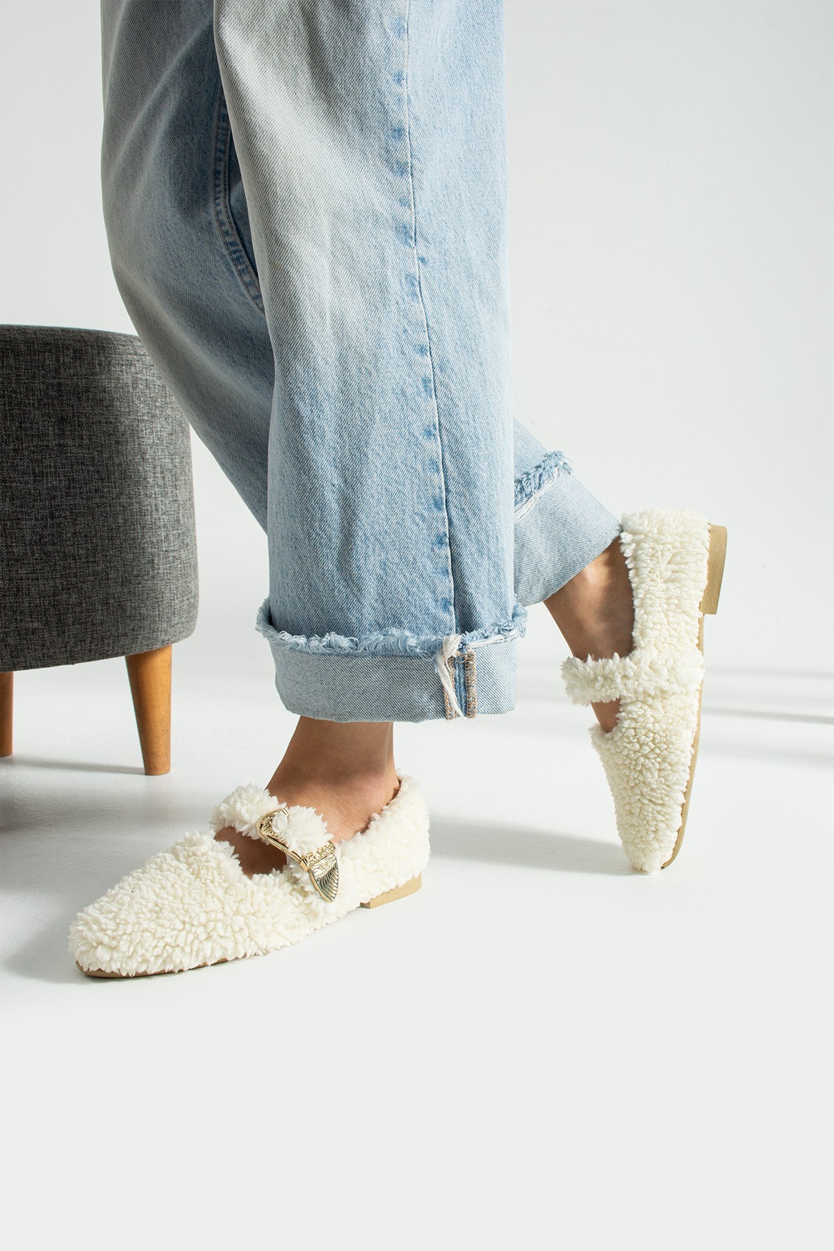 Kadın Tokalı Tüylü Peluş Babet Ev Terliği TS1189