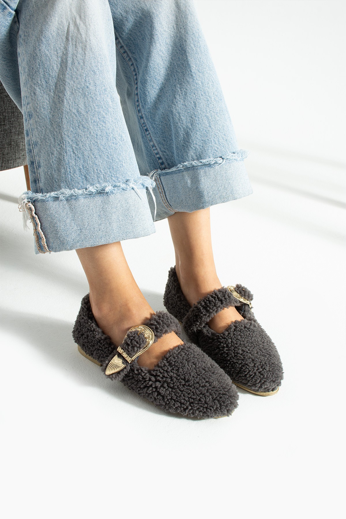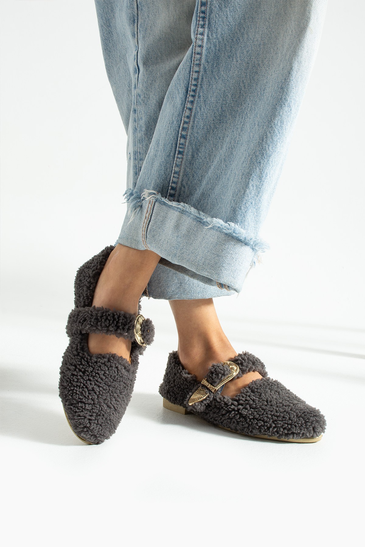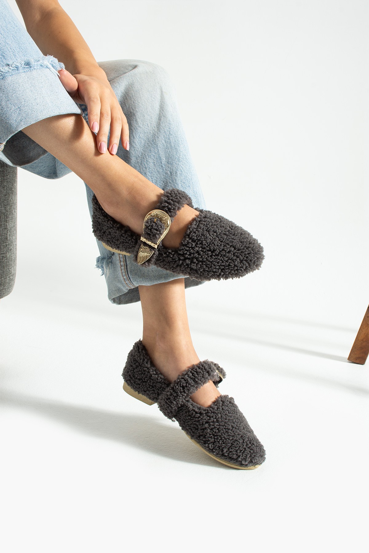 Kadın Tokalı Tüylü Peluş Babet Ev Terliği TS1189