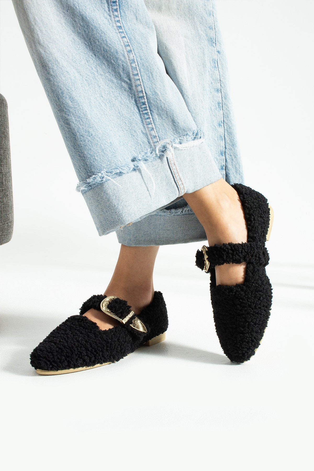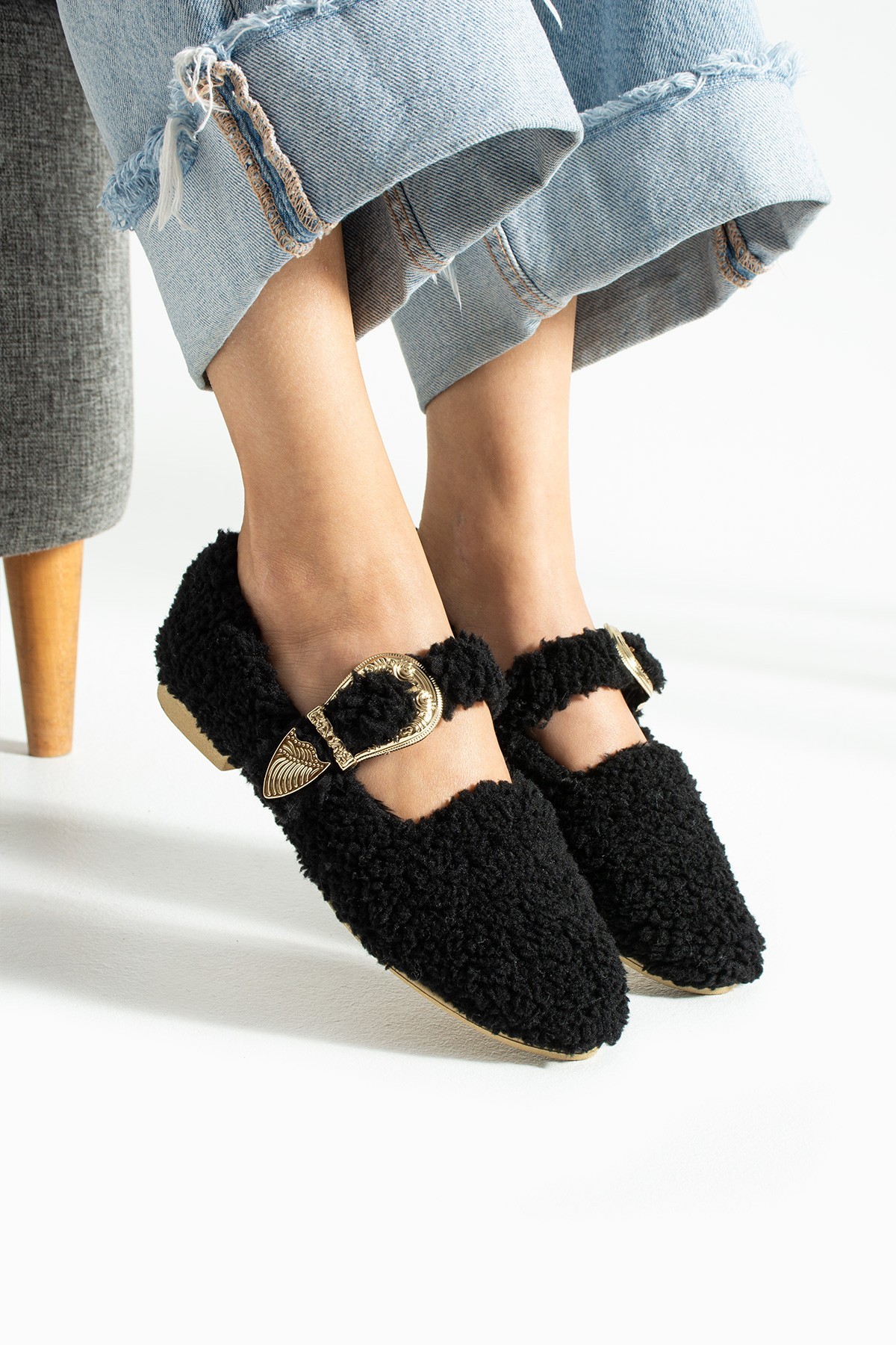 Kadın Tokalı Tüylü Peluş Babet Ev Terliği TS1189